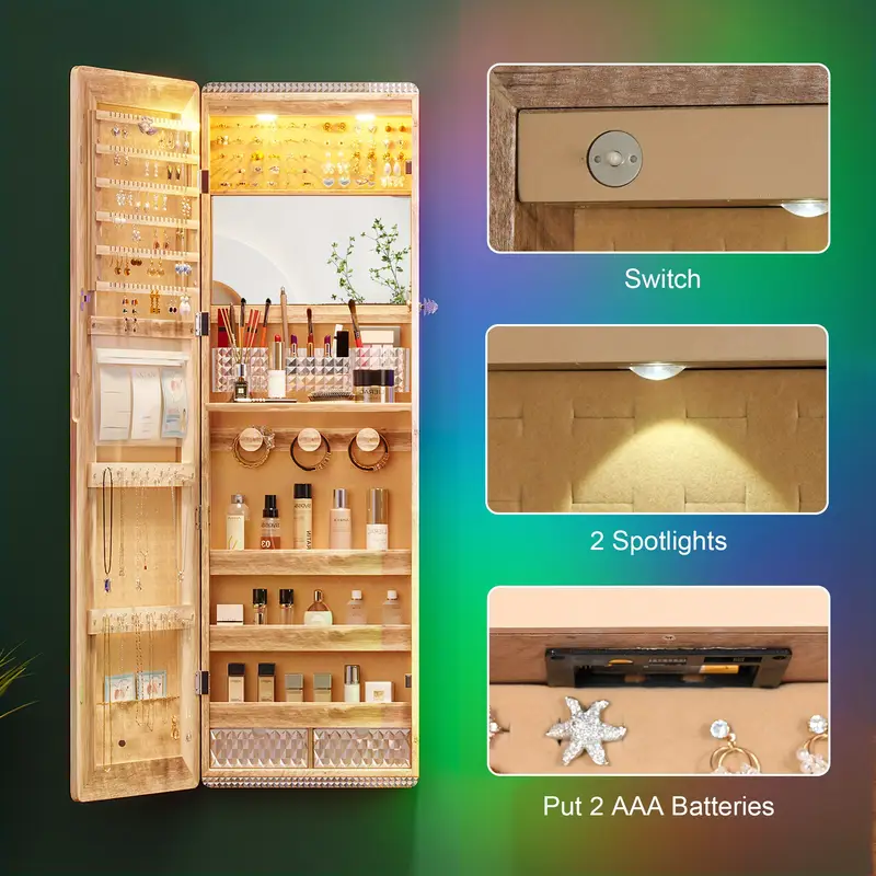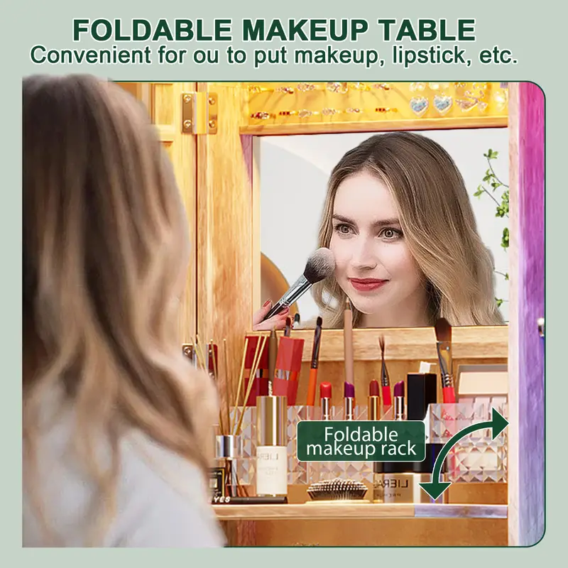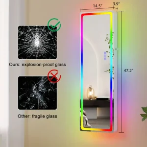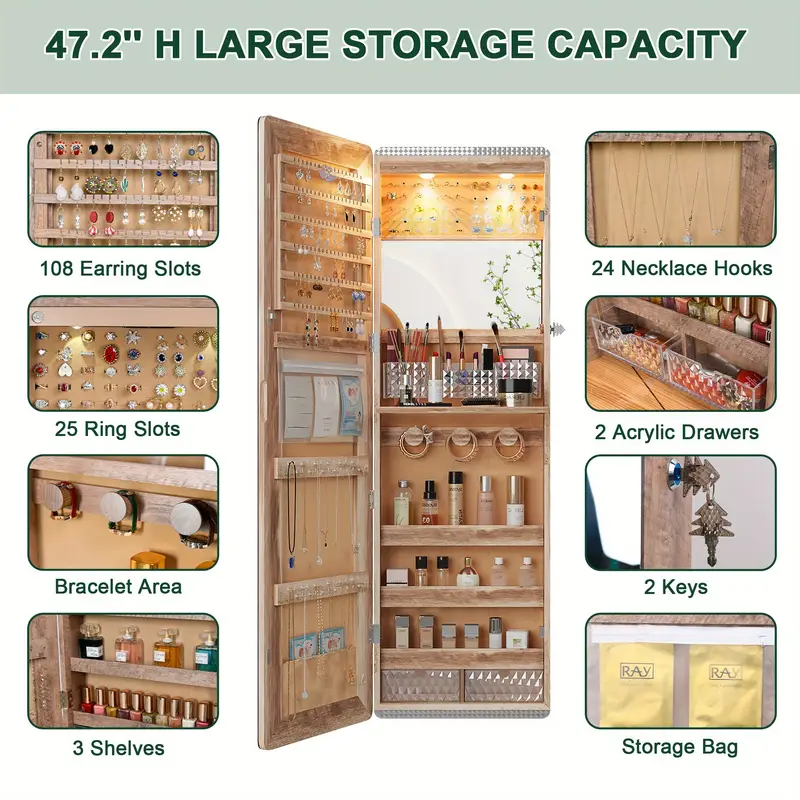 HNEBC LED Mirror Jewelry Cabinet with RGB Lights, 47.2″ Wall-Mounted Wooden Armoire Organizer, Full-Length Mirror, 2 Drawers, Lockable Storage for Bedroom & Bathroom, Contemporary Design, White Hardwood Finish – SM Markets Online